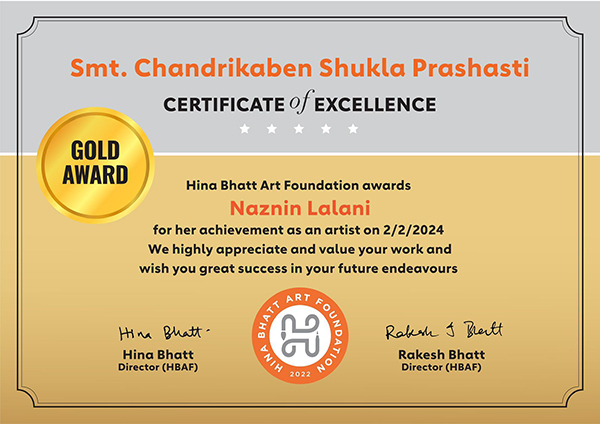 Smt. Chandrikaben Shukla Prashasti Gold Award for excellence as an artist goes to Naznin Lalani. (footprint of past)